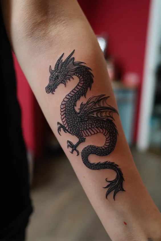 This classic black dragon tattoo stretches along the outer forearm of a woman, featuring bold linework and dense shading that gives the scales a textured, almost armor like feel. The dragon’s body curves naturally with the arm, and its fierce expression adds intensity without overwhelming the design. The size is medium to large, making it a strong focal point while still feeling balanced on the limb.