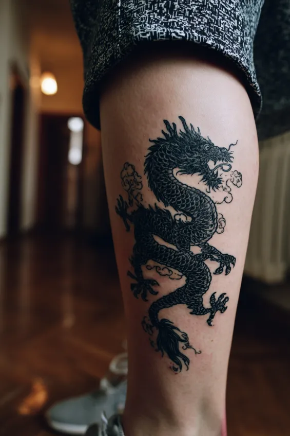 This large black dragon wraps across the upper thigh of a woman, with intricate scale work and heavy shading that gives it depth and movement. The dragon’s body curves with the natural shape of the leg, creating a flattering and dynamic composition. The size makes it a true statement piece.