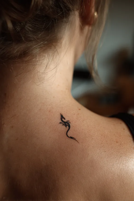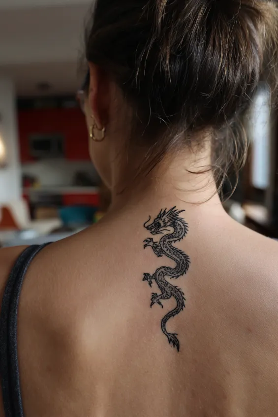 This small black dragon sits delicately on the upper back of a woman near the shoulder area. The linework is fine and clean, with minimal shading that keeps the design light and subtle. It is petite in size but still clearly defined.