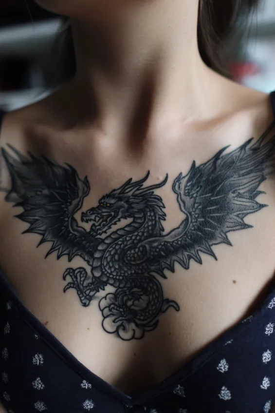 This bold chest tattoo showcases a classic black dragon with its wings spread wide across a woman’s upper chest, just below the collarbones. The detailing in the scales and claws is sharp and dramatic, with deep black shading that gives the dragon a slightly three dimensional look. The placement draws attention to the neckline and frames the shoulders beautifully.