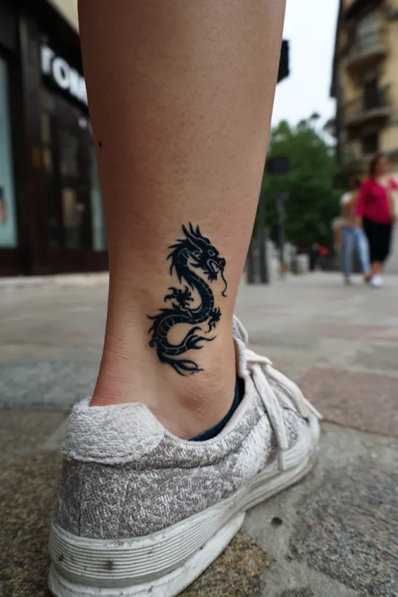 This small black dragon is placed just above the ankle of a woman, with detailed scales and a compact coiled body. The design is simple yet bold, using solid black ink to keep it classic and clean. Its size makes it subtle but still eye catching.