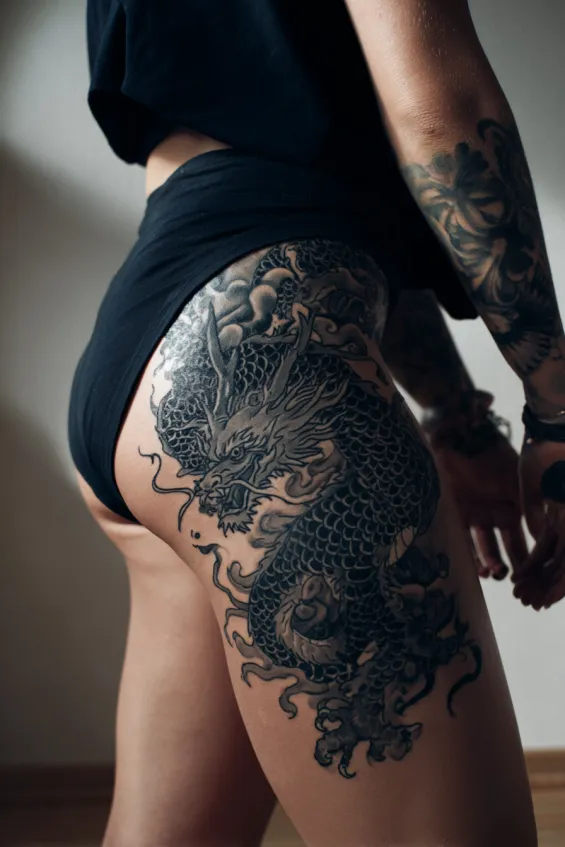 This dramatic thigh piece features a large black dragon stretching across the upper thigh and hip of a woman. The detailing is intricate, with heavy black shading and carefully defined scales that follow the curve of the leg. The size makes it impossible to ignore.