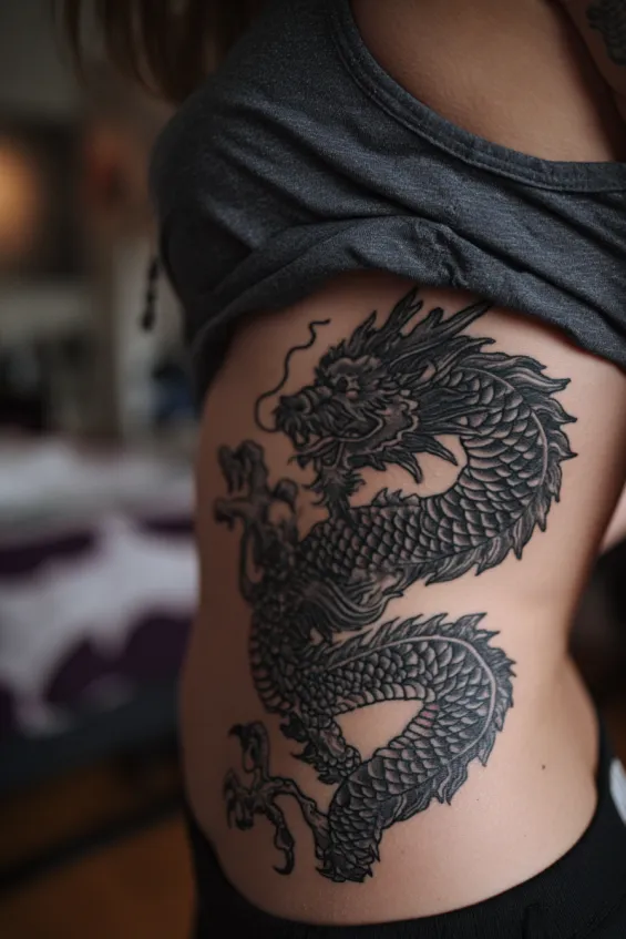 This ribcage tattoo displays a long black dragon coiling along the side of a woman’s torso. The design follows the natural curve of the ribs, with fine detailing in the scales and claws. The black ink is rich and dense, creating a striking contrast against the skin.