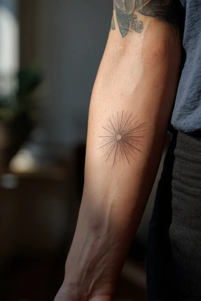This piece shows a delicate burst of light lines tattooed along the inner forearm, spreading outward in a soft and balanced pattern. The fine line work keeps it airy and refined, and the placement allows the design to flow naturally with the shape of the arm.