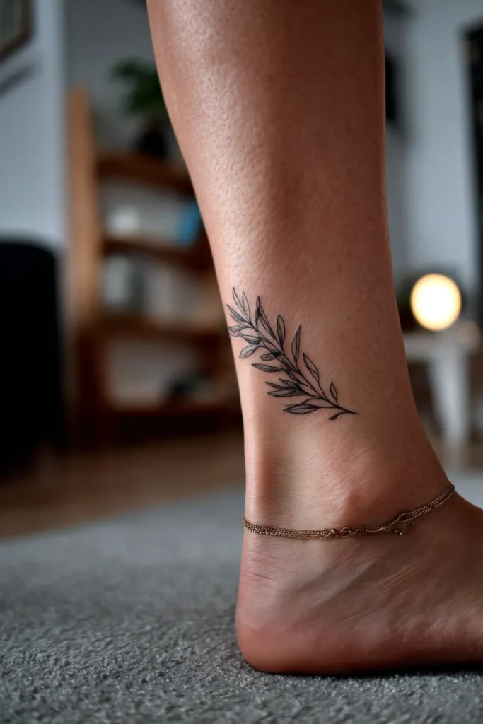 This tattoo features a slim olive branch wrapping gently above the ankle, inked in fine black lines with simple leaf detailing. The design follows the curve of the leg beautifully, giving it an organic and effortless look.