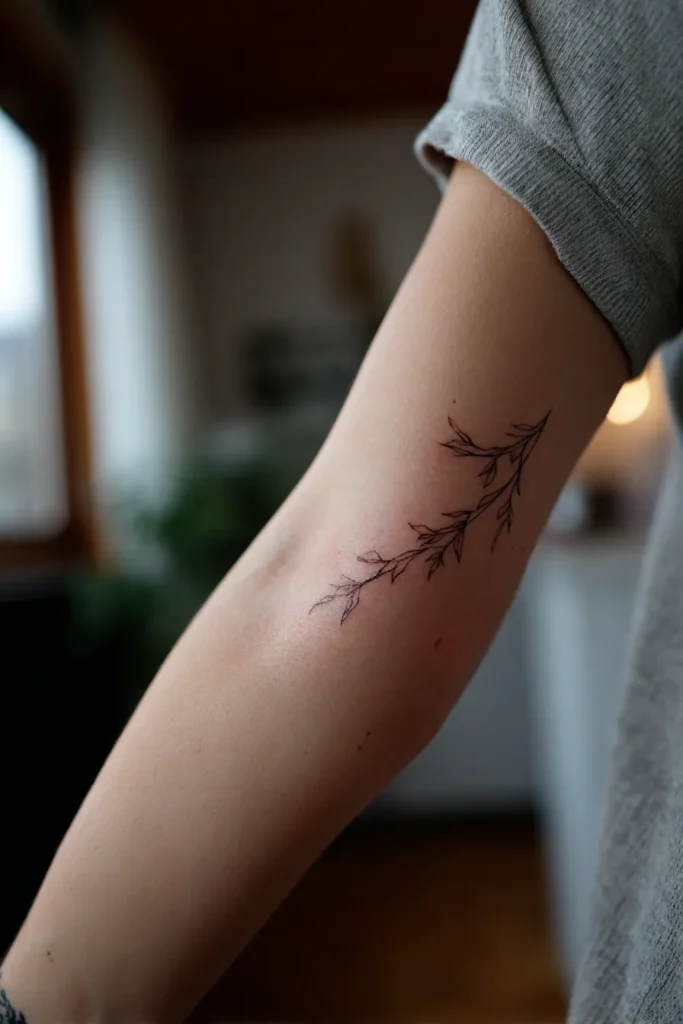 This tattoo shows a slim botanical branch stretching softly along the inner arm, done in fine black linework with delicate leaves that feel light and organic. The placement follows the natural line of the arm beautifully, and the minimal detail keeps the design airy rather than heavy, making it feel calm and intentional instead of bold.