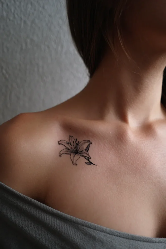 This tattoo features a delicate lily resting along the collarbone, drawn in soft fine line black ink with gentle petal details and light shading. The flower sits naturally against the curve of the shoulder, giving it a graceful and balanced look without feeling oversized. Every line feels intentional and airy, keeping the design clean while still letting the floral details shine.