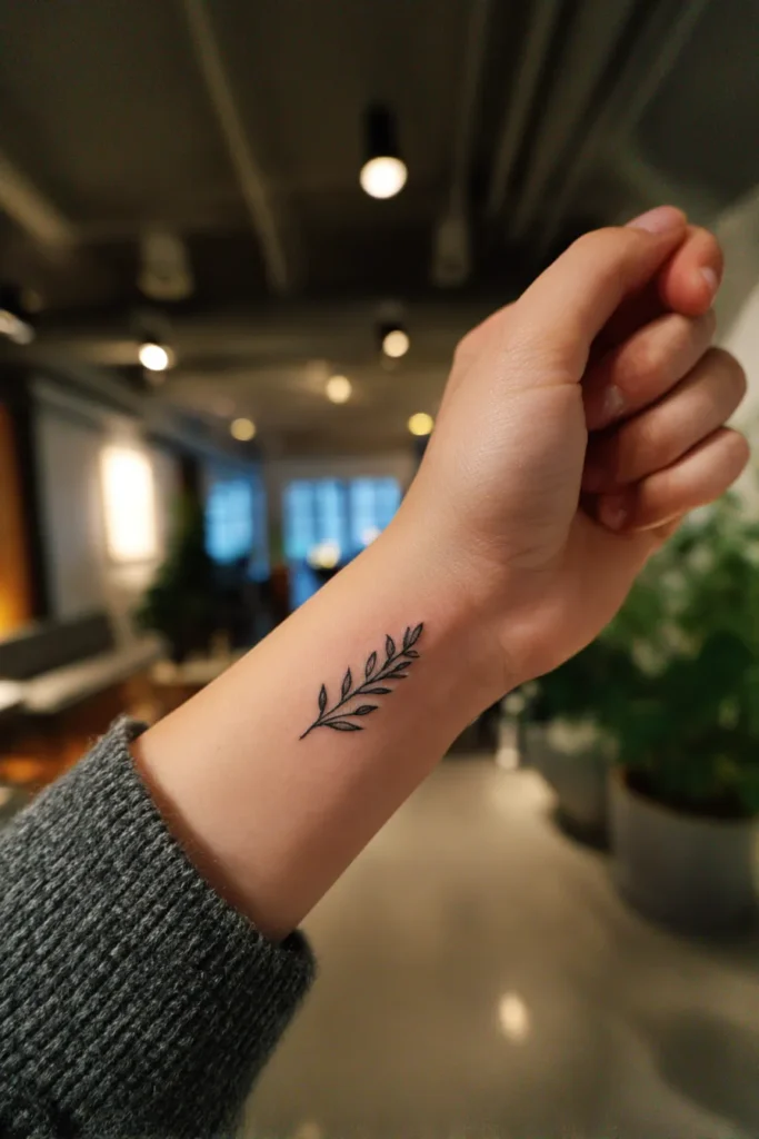 This design shows a small olive branch placed along the inner wrist, created with thin black linework and simple leaf details. The branch flows naturally with the wrist shape, keeping the look soft and balanced. Its modest size and clean execution make it subtle enough for everyday life while still feeling thoughtfully placed.