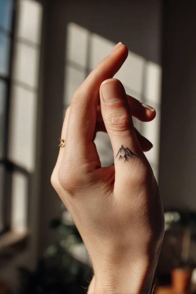 This tattoo shows a tiny mountain outline placed along the side of the finger, created with fine black linework and a clean minimalist style. The peaks are simple and sharp with no shading, giving it a crisp and understated look that fits the narrow space perfectly. Its small size makes it subtle enough to feel personal while still being visible during everyday moments.
