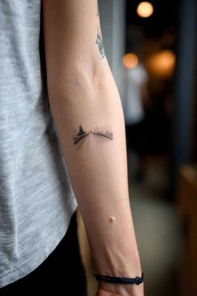 This tattoo shows a small pathway scene placed along the inner forearm, created with fine black and grey shading that keeps everything soft and minimal. The road gently narrows toward the center with subtle texture on each side, giving it depth without heavy detail. Its placement makes it easy to notice while still feeling personal, and the muted tones help it blend naturally with the skin.