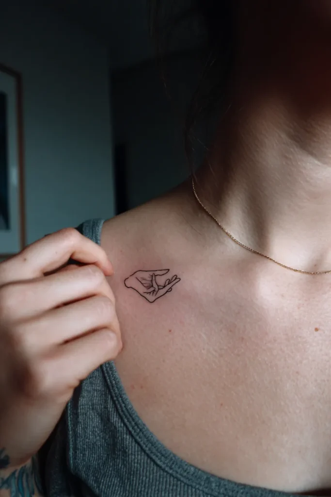 This tattoo features a simple open hand design placed near the collarbone, created with clean fine line black ink and soft natural curves. The linework is minimal and airy, focusing on the shape of the hand without extra detail or shading. Its placement feels intimate and balanced, sitting gently against the skin without overpowering the area.