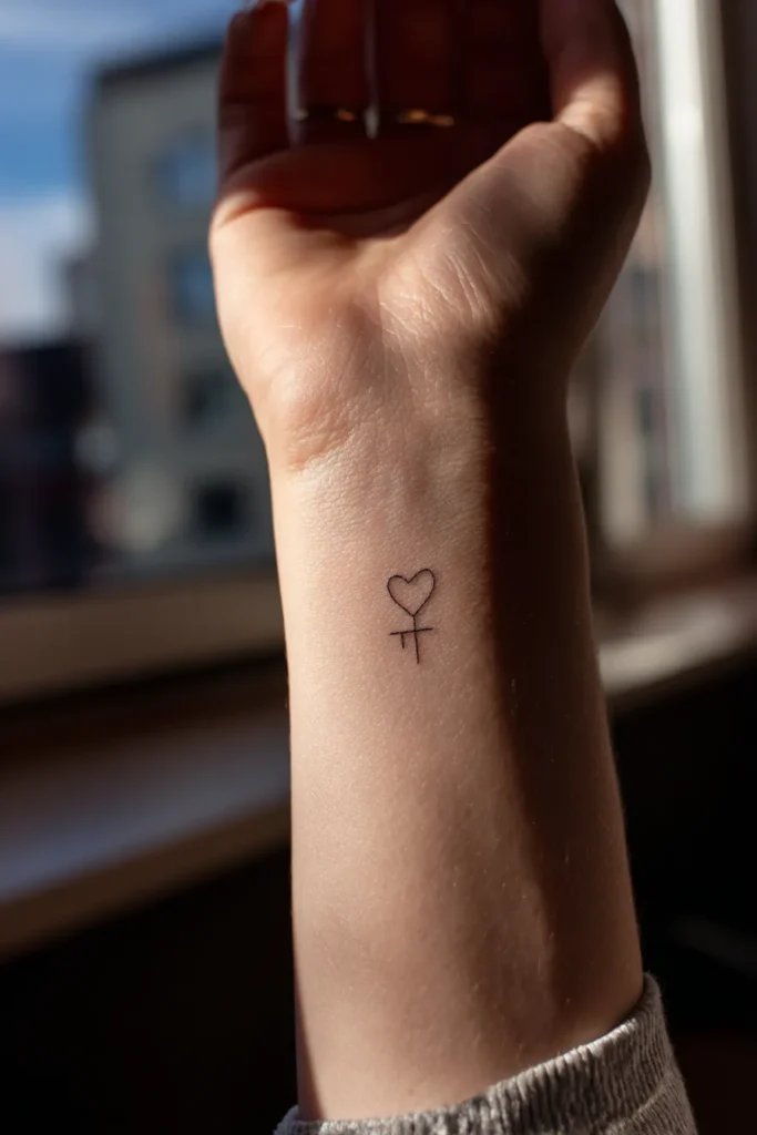 This tattoo shows a small heart with a subtle cross detail placed on the inner wrist, done in fine black linework with a clean and minimal finish. The design is delicate and compact, making it feel light on the skin while still clearly defined. Its placement keeps it personal and easy to glance at, perfect for a tattoo meant to stay close rather than stand out loudly.