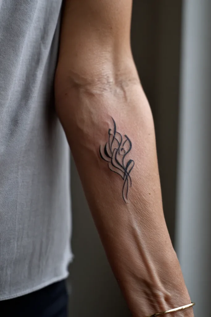 This tattoo features an abstract flame inspired design running vertically along the forearm, created with fine black lines and graceful curves. The lines move upward in a fluid motion, giving the tattoo a sense of energy without heavy shading or bold outlines. Its placement allows the design to breathe and flow with the arm, keeping everything balanced and refined.
