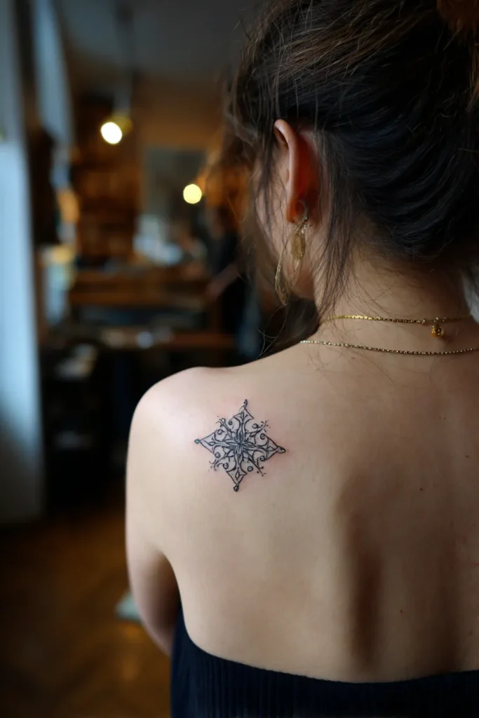 This tattoo features an intricate cross design placed softly on the upper back, created with fine black linework and delicate ornamental details. The symmetrical pattern feels balanced and intentional, with gentle curves and small accents that add depth without making it feel heavy. Its placement allows the design to sit naturally between the shoulders, giving it presence while still keeping everything refined and clean.