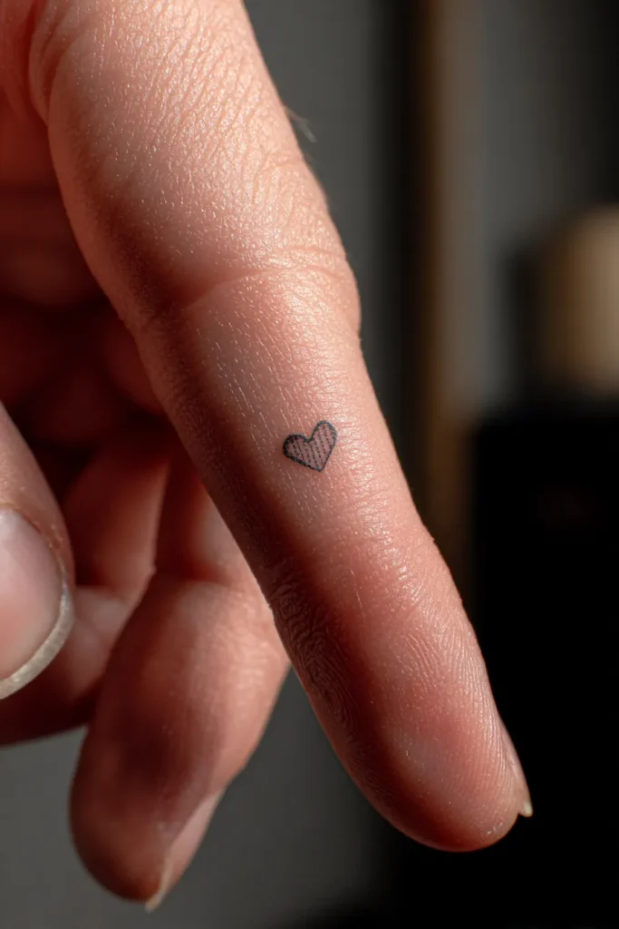This tattoo shows a tiny heart placed gently on the side of the finger, done in fine black ink with a simple and clean outline. The small scale fits the finger perfectly, keeping the design subtle and easy to miss unless you are really looking. Its minimal style makes it feel personal and intimate, like a quiet secret rather than a statement.