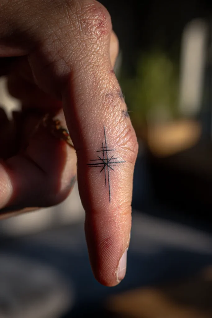 This design shows a slim vertical cross tattooed along the side of the finger using ultra fine lines and soft black ink. The placement is bold in choice but gentle in execution, with the narrow shape fitting naturally along the finger without overpowering it.