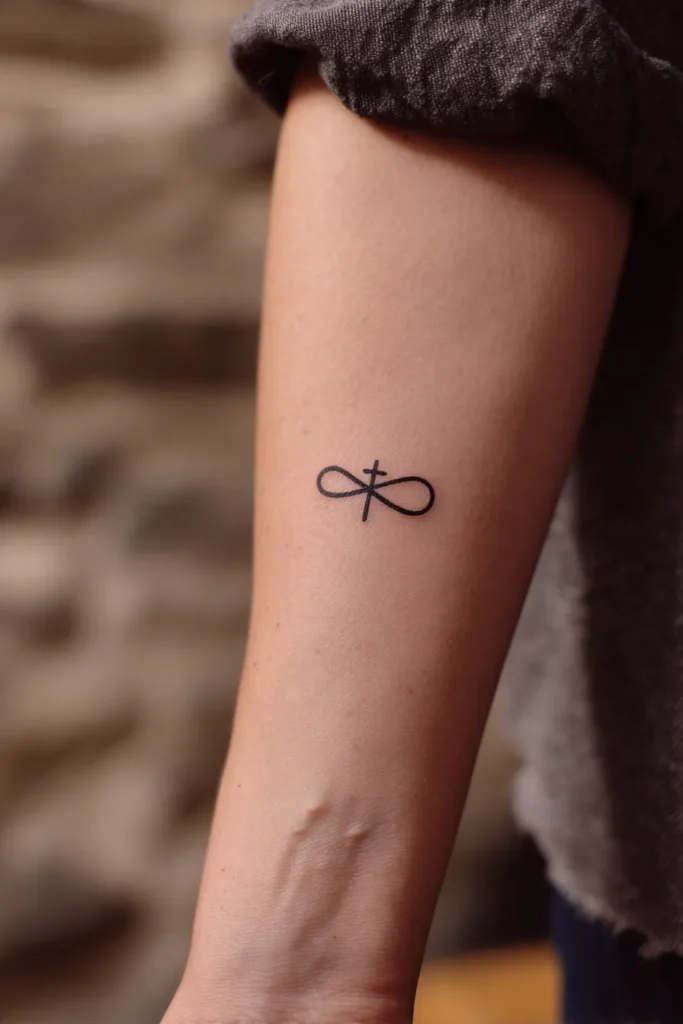 This tattoo displays a small infinity symbol inked in a clean fine line style along the inner forearm, keeping the design airy and balanced. The lines are smooth and minimal, with enough breathing room around the tattoo to let it feel light and intentional.