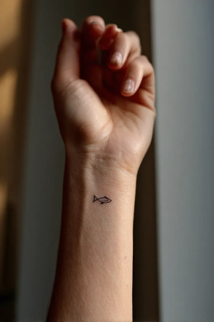 This tattoo features a tiny ichthys fish placed delicately on the inner wrist, done in clean fine line black ink. The lines are crisp and simple with no shading, giving it a lightweight and almost barely there feel. Its small size makes it subtle and elegant, sitting naturally along the wrist where it feels personal rather than performative.