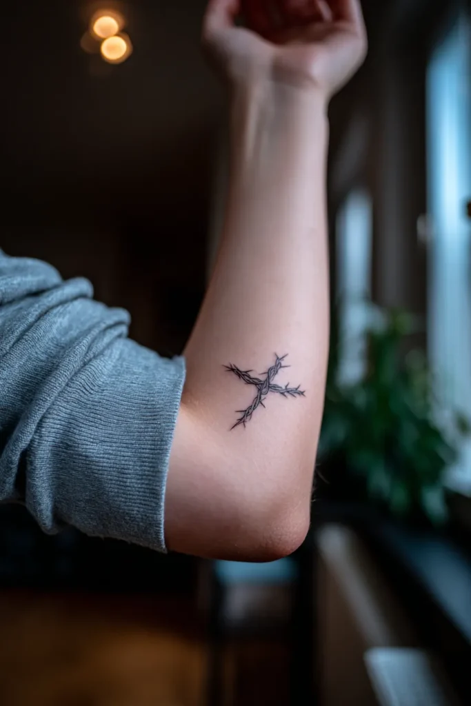 This design features a small cross tattoo placed on the inner arm, rendered in thin black lines with a hand drawn softness. The placement makes it easy to see yet still intimate, and the slightly imperfect linework adds warmth rather than rigidity. Its modest size keeps it clean and wearable for everyday life.