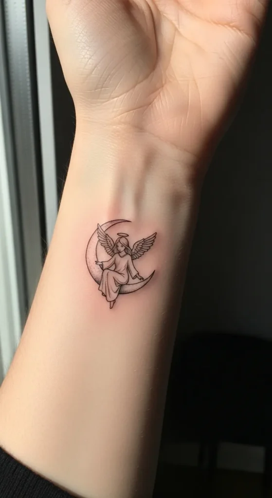 This dainty wrist tattoo features a fine line illustration of a graceful angel perched comfortably on a slender crescent moon. The design is small and minimalist, using delicate black ink with subtle stippling for shading that gives the moon a soft, textured glow. The angel herself is dressed in flowing robes with beautifully detailed feathered wings and a tiny floating halo above her head. It is a perfect example of micro-realism that fits snugly on the inner wrist, making it easy to show off or hide whenever you feel like it.