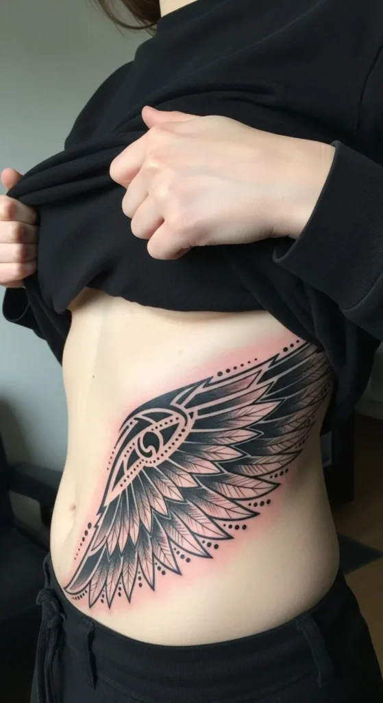 This design takes over the side of the torso with a large tribal inspired wing that flows effortlessly from the ribcage down to the hip. It uses heavy black ink and bold linework to create sharp, pointed feathers that feel both modern and ancient at the same time. The center of the wing features a striking eye motif encased in geometric shapes, which adds a mysterious focal point to the piece. Tiny black dots trail along the edges of the feathers, giving the large-scale tattoo a bit of texture and a finished, polished look. It is a monochrome masterpiece that uses the natural curves of the waist to make the wing look like it is ready to take flight.