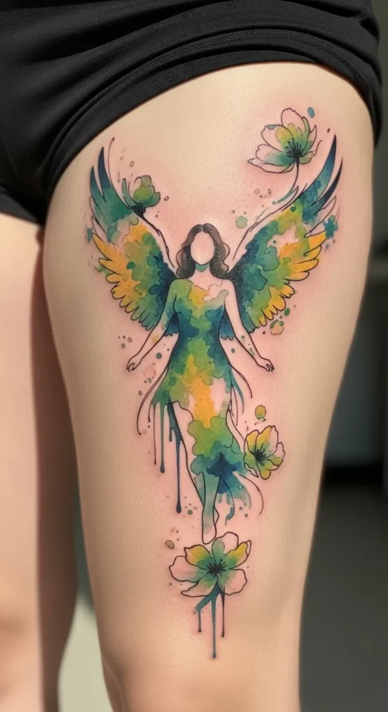 This thigh piece is a stunning display of the watercolor tattoo style, featuring a faceless angel silhouette that feels both mysterious and modern. The design uses a bold palette of emerald greens, teals, and sunny yellows that look like they were splashed onto the skin with a paintbrush. Delicate black linework defines the wings and the flowing dress, while three sketched flowers drift around the figure to add a soft, botanical touch. It is a medium to large-scale design that takes full advantage of the flat surface of the upper leg, allowing the “paint drips” at the bottom to create a sense of movement as if the ink is still wet.