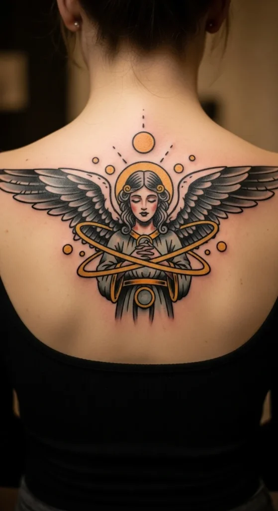 This stunning piece sits right at the center of the upper back and takes over the space between the shoulder blades with a bold neotraditional flair. The design features a serene angel with her eyes closed and hands clasped in prayer, framed by thick black linework and soft grey shading in her robes and wings. What really makes this pop is the vibrant mustard yellow used for the double rings circling her body and the glowing halo above her head. Small geometric dots and circles float around the figure, giving the whole medium-sized tattoo a balanced and slightly mystical feel.
