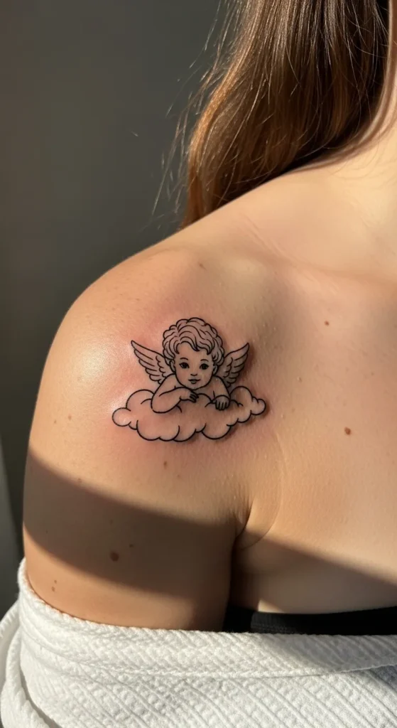 This charming design features a classic cherub resting playfully on a fluffy cloud right on the front of the shoulder. It is executed in a clean, fine-line style with bold black outlines that give it a crisp and illustrative feel. The size is small to medium, making it a perfect fit for that curved space between the collarbone and the arm. You can see beautiful detail in the curly hair and the tiny feathered wings, while the soft shading on the cloud adds just enough depth to make the little angel pop against the skin.