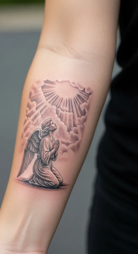 This forearm tattoo features a stunning black and grey illustrative style that captures a kneeling angel in deep prayer. The piece uses a medium-sized vertical layout to perfectly fit the inner arm, showing the angel looking upward toward a breakthrough of radiant light beams streaming through soft, puffy clouds. The shading is incredibly smooth, especially in the feathers of the wings and the folds of the angel’s robes, giving the whole scene a three-dimensional feel despite using only monochromatic tones. The fine line work around the light rays creates a focal point that draws your eye right to the top of the design.
