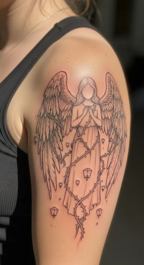 This fine-line piece on the upper arm features a faceless angel with large feathered wings and a flowing gown. The design is unique because it wraps the figure in a winding vine of sharp thorns that contrasts with the soft texture of the feathers. Floating around the angel are several delicate paper lanterns of varying sizes that add a sense of movement and light to the composition. It is a medium-sized black and grey tattoo that uses thin needlework and subtle dot shading to create depth without feeling heavy or dark.
