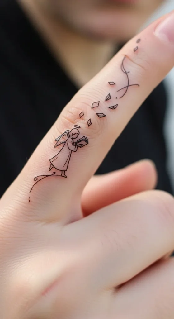 This adorable tattoo is placed on the side of the index finger and features a tiny angel lost in a book. The design is done entirely in black ink with ultra-thin strokes that give it a delicate and airy feel. You can see the little figure wearing a simple robe and a circular halo while pages seem to flutter out of the book and drift toward the fingertip. The artist added some swirling dots and light trails at the base and tip to create a sense of movement and magic in such a small space.