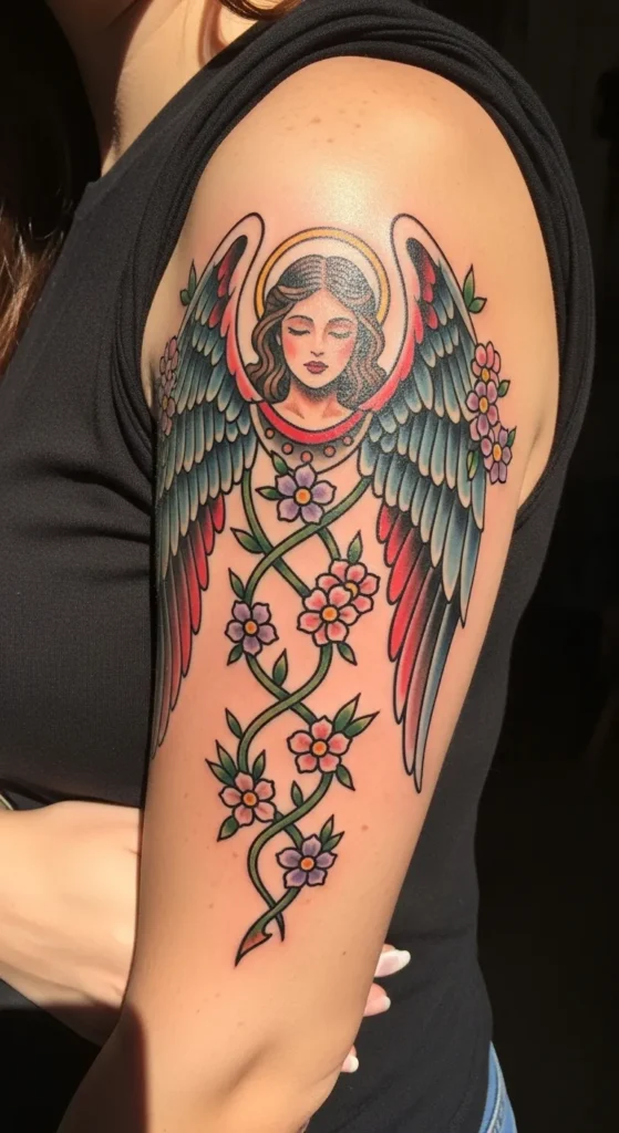 This upper arm piece brings a bold American traditional vibe to life with thick black outlines and a vibrant color palette. The design features a serene angel with cascading brown hair and a golden halo nestled between two expansive wings that transition from deep teal to a striking red gradient. Instead of a traditional body the angel flows into a delicate double-helix vine of green leaves and pastel pink and purple flowers that stretches down the tricep. It is a large vertical design that perfectly utilizes the natural curve of the shoulder to create a sense of movement.