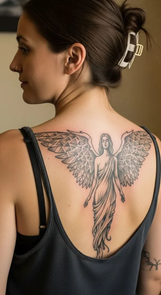 This stunning back piece features a graceful angel figure descending right along the spine in a classic black and gray illustrative style. The placement is perfectly centered between the shoulder blades, which allows the wings to span across the upper back for maximum impact. While the angel herself has a soft and traditional feel with flowing drapery and delicate features, the wings are the real showstopper here. They are filled with intricate geometric patterns and small triangles that give the feathers a modern and mosaic look. It is a medium-to-large design that manages to feel bold yet refined because of the clean linework and subtle shading.