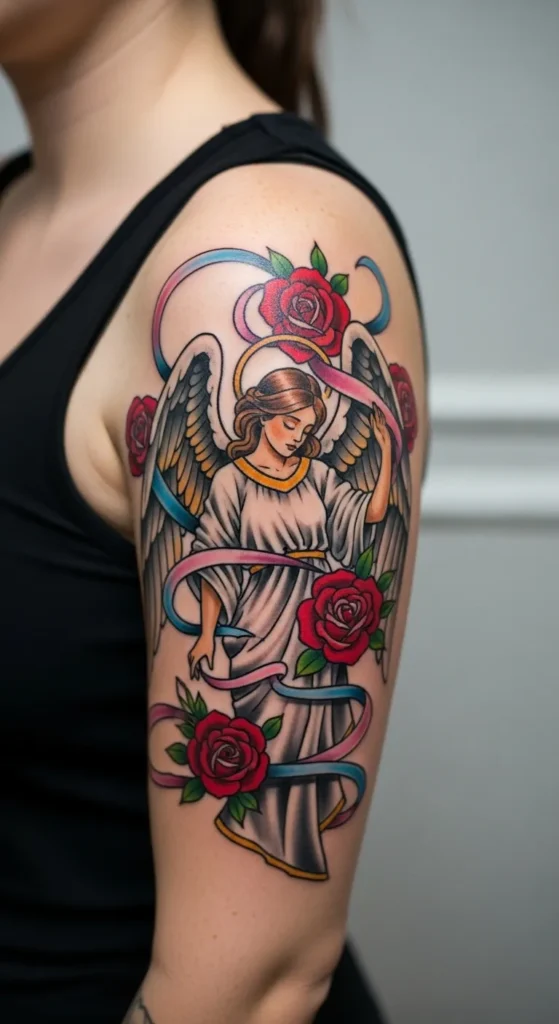 This shoulder piece is a stunning example of the neotraditional style, featuring a graceful angel wrapped in flowing blue and pink ribbons. The design covers a significant portion of the upper arm, making it a bold statement piece. Deep red roses with vibrant green leaves frame the figure, adding a classic touch to the modern illustrative look. The angel is dressed in a flowing white robe with gold trim, and the bold black outlines really make those saturated colors pop against the skin.