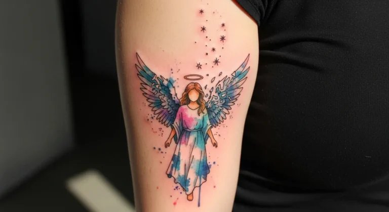 I find this design so incredibly striking because it feels like a dream captured right on the skin. The way the colors bleed into each other reminds me of a sunset, and that little trail of stardust adds such a magical, protective vibe. It is the perfect choice if you want something that represents a guardian watching over you, but you also want to skip the heavy, traditional look for something more artistic and fluid. I honestly can’t get over how those tiny geometric details in the wings make the whole thing pop without losing that soft, feminine energy we all love.