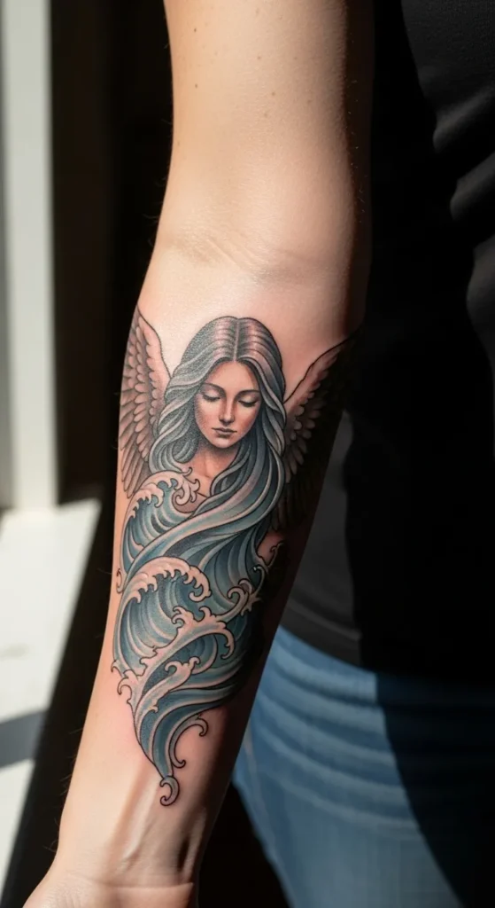 This tattoo features a stunning fusion of a serene angel and crashing ocean waves placed perfectly on the inner forearm. The style blends neo-traditional elements with illustrative shading to create a piece that feels both classic and fresh. Her calm face and closed eyes are framed by flowing hair that seamlessly transitions into teal and blue stylized waves. The soft gray shading in the wings provides a lovely contrast to the vibrant sea foam, while the medium size allows every delicate line to pop against the skin.