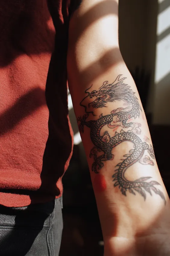 I think forearm tattoos are such a bold move. You see them every day, and so does everyone else. This dragon feels like a daily reminder of resilience and fire, which honestly is something I could always use.