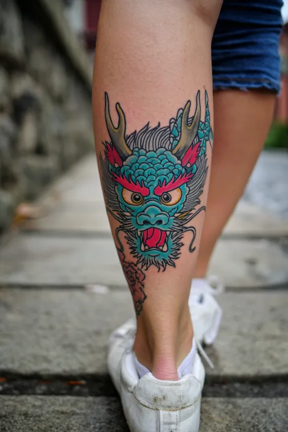 This tattoo showcases a colorful dragon head on the calf with bright turquoise, red, and green tones. The style leans neo traditional with strong outlines and saturated colors. It is medium in size and positioned front facing on the lower leg.
