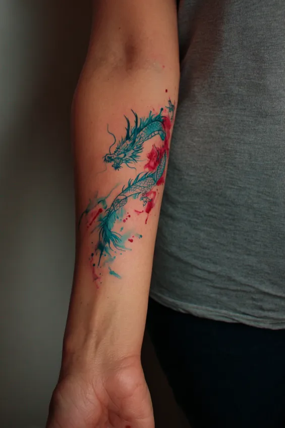 This tattoo features a vibrant watercolor dragon placed along the inner forearm. The design blends bright turquoise, coral, and hints of pink, with paint like splashes that fade softly into the skin. The dragon curves upward in a fluid motion, medium in size, with loose edges and artistic brushstroke details that give it a dreamy, expressive feel.