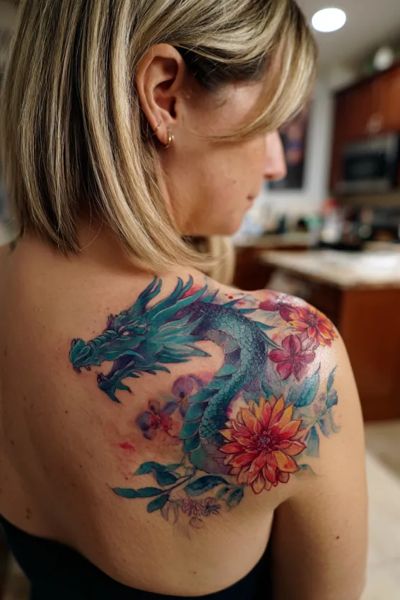 This tattoo is a stunning dragon intertwined with large, detailed flowers across the upper shoulder and back. The dragon is shaded in teal and deep blue, while the florals bloom in warm pinks and oranges. This medium to large piece spreads across the shoulder blade beautifully, balancing fierce scales with soft petals.