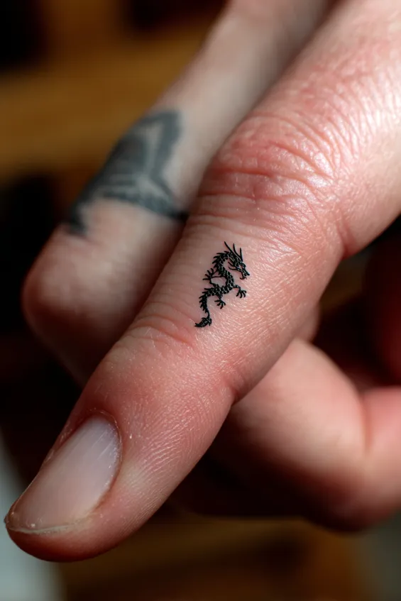 This tattoo is a small black dragon inked along the side of the finger. The design is minimal, with fine line details forming a tiny curled dragon silhouette. Its size is petite but clearly defined, making it a subtle yet bold statement piece.