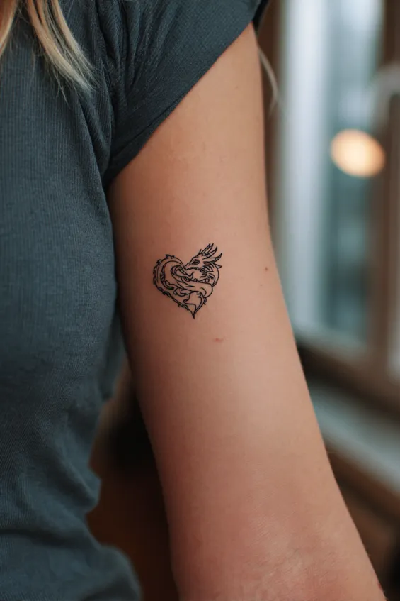 This tattoo features a small dragon formed into a heart shape on the upper arm. Done in black ink with simple linework, it is minimalist and clean. The size is small to medium, sitting neatly on the outer arm without overwhelming the space.