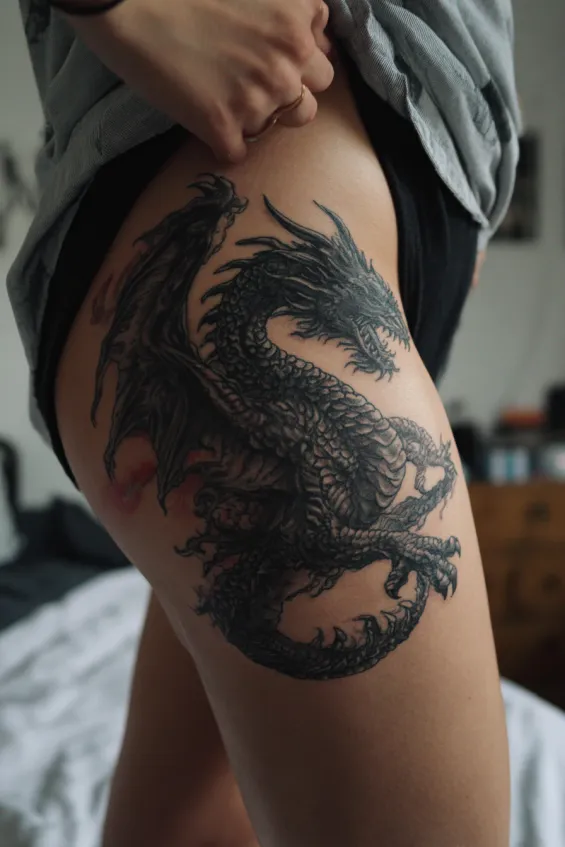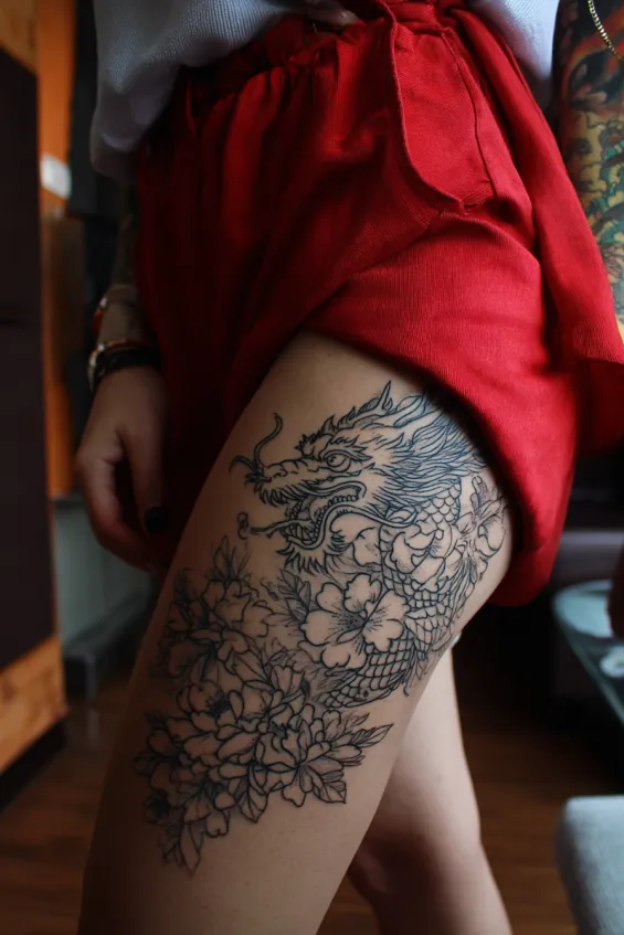 This tattoo blends a dragon with delicate floral elements on the upper thigh. The dragon is drawn in black and grey, while the flowers add softness and contrast. The composition feels balanced, with the dragon weaving through petals and leaves. It is medium to large in size and hugs the curve of the thigh naturally.