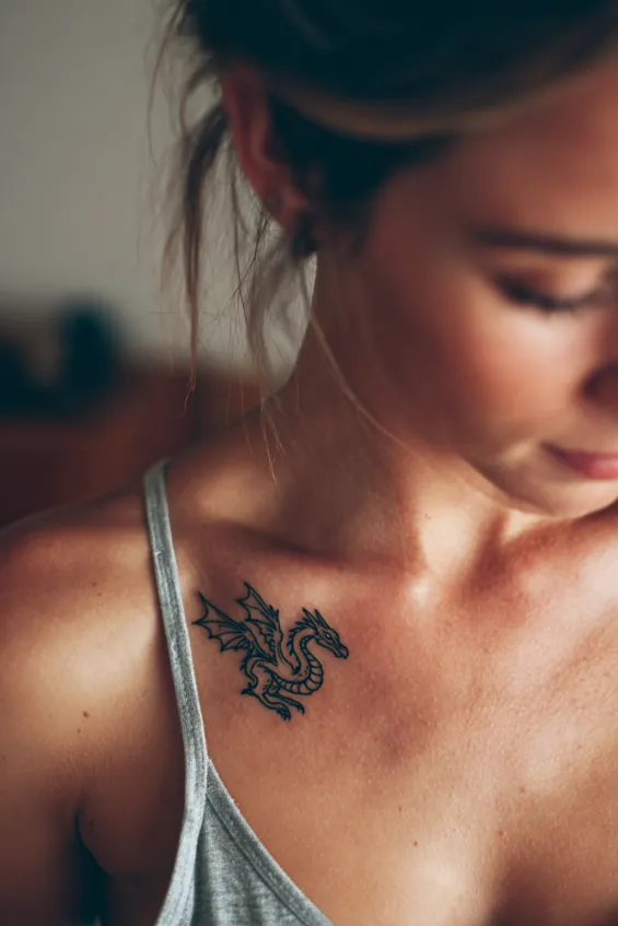 This tattoo shows a small dragon resting near the collarbone. The fine line style keeps it elegant, with subtle curves and a lightly detailed body. The size is petite, making it a soft accent rather than a bold statement.