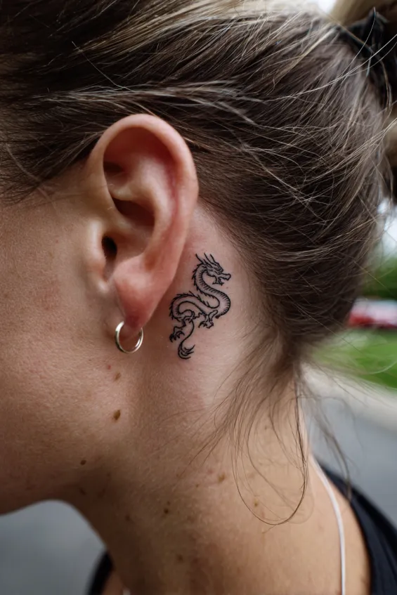 This tattoo features a tiny dragon placed just behind the ear. The black ink design is minimal, with delicate linework shaping the wings and tail. It is small and discreet, visible only when hair is pulled back.