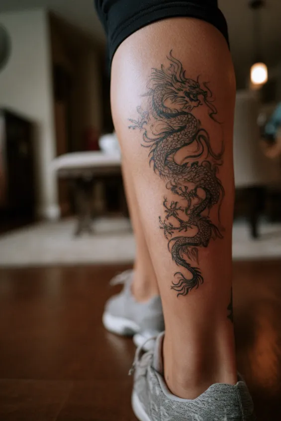 This tattoo shows a vertically placed dragon running down the calf. The design is slimmer and more elongated, with fine line detailing and soft black and grey shading. It follows the natural line of the leg beautifully, almost like the dragon is climbing upward. The size is medium to large, but the placement keeps it sleek and refined.