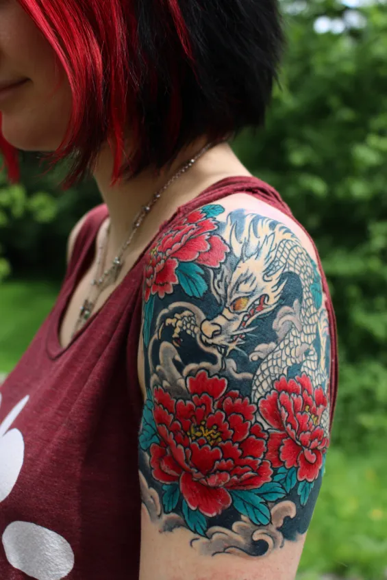 This tattoo is a vibrant sleeve that pairs a dragon with bold red peonies. The dragon flows through the arm in classic Japanese inspired style, surrounded by rich florals and detailed shading. The colors are saturated and lively, with reds and greens standing out against the skin. It is a full upper arm piece that demands attention.