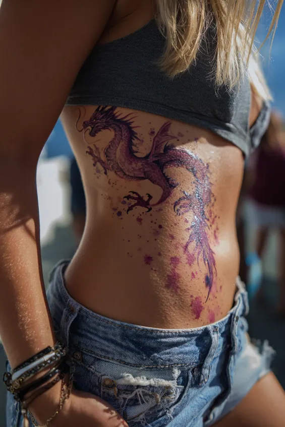 This tattoo shows a purple and magenta toned dragon sweeping across the ribcage. The watercolor style gives it splashes of color and softer edges, with paint like strokes blending into the skin. It is medium in size and follows the natural curve of the waist and ribs.