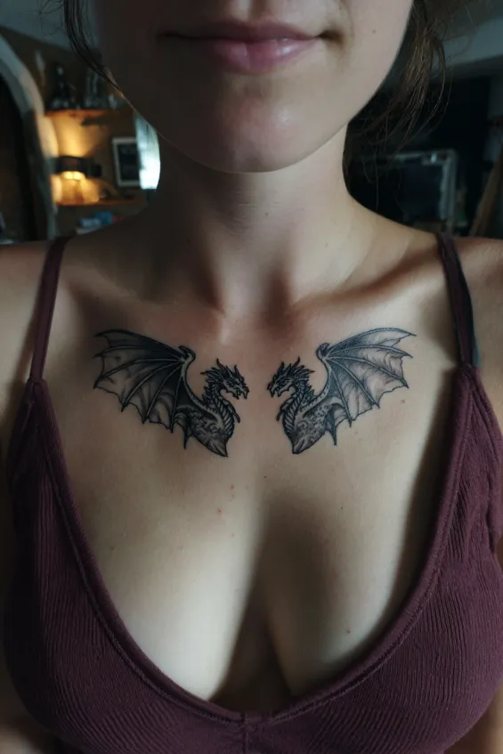 This tattoo features two dragons mirrored across the upper chest just below the collarbones. The wings stretch outward toward each shoulder, forming a symmetrical black ink design. The size is medium, with detailed linework and light shading that gives the wings texture.