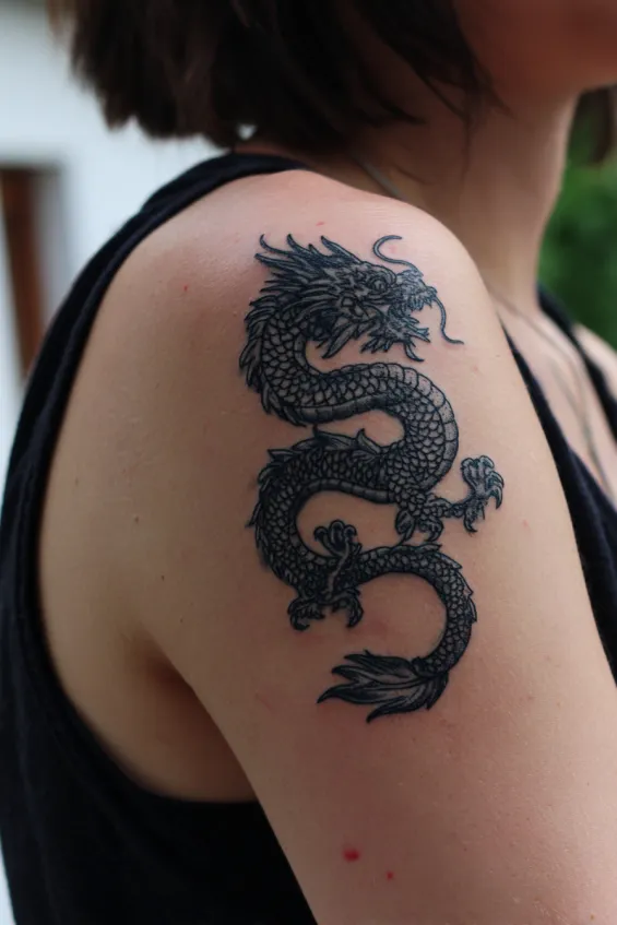 Shoulder tattoos always give off quiet confidence. I like how this dragon feels compact but intense. It is like carrying your strength right where the world can see it when you choose to show it.